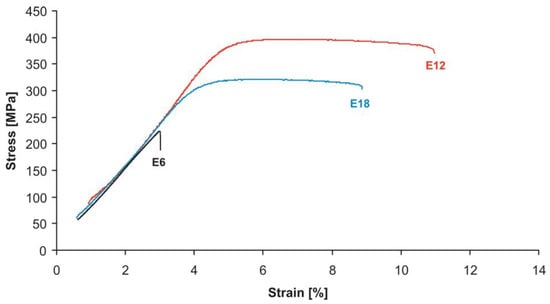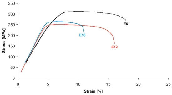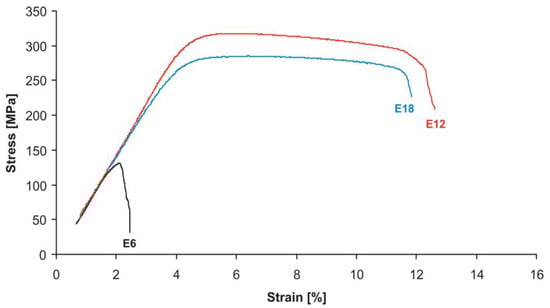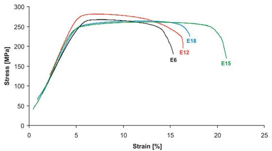 Table 5, Table 6, Table 7 and Table 8 present the averaged (over three specimens) values of the mechanical properties of the studied alloys obtained in tensile testing, depending on the rolling temperature and the reduction ratio. The typical stress–strain curves for the samples are shown in Figure 8, Figure 9, Figure 10 and Figure 11. For clarity, the histograms of the distribution of mechanical properties for each alloy were plotted depending on the rolling temperature and the reduction ratio (Figure 12, Figure 13, Figure 14 and Figure 15).