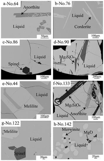The microstructures and phase compositions of the quenched samples were determined by EPMA. Anorthite (CaO·Al2O3·2SiO2), cordierite (2MgO·2Al2O3·5SiO2), dicalcium silicate (Ca2SiO4), melilite (2CaO·MgO·2SiO2-2CaO·Al2O3·SiO2), merwinite (3CaO·MgO·2SiO2), MgO, mullite (3Al2O3·2SiO2), spinel (MgO·Al2O3) and forsterite (2MgO·SiO2-2CaO·SiO2) were observed in the quenched samples. Typical backscattered SEM micrographs of the quenched samples are shown in Figure 2a–f. Figure 2a–e show the coexistence of liquid with anorthite, cordierite, spinel, Mg2SiO4 and melilite, respectively. Figure 2f–h show the coexistence of liquid with anorthite and Mg2SiO4, melilite and spinel, MgO and merwinite, respectively. It can be seen from the figures that rapid cooling enabled the liquid to be converted to the uniform glass. All solid phases have a sharp edge and large enough size for EPMA measurements.