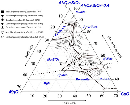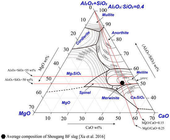 Due to the shortage of high-grade iron ore resources and the increasingly fierce competition in the steel market, many steel enterprises face the use of low-quality raw materials [1]. However, a variety of negative problems, including incomplete separation of slag and hot metal, difficult tapping of the slag from the blast furnace and inefficient reaction between slag and hot metal, can happen when using low-quality raw materials [2,3,4]. On the other hand, a modern blast furnace with automatic operating system can adjust the parameters accurately if the required information is available. Hence, more accurate slag phase equilibrium information should be provided for modern blast furnaces to treat complex raw materials [5,6,7]. The oxide system CaO-MgO-Al2O3-SiO2 forms a base for ironmaking slags. SiO2 and Al2O3 are mainly from raw materials such as iron ores, coke and coal. CaO and MgO are mainly added as flux to adjust the slag composition to obtain the required properties.
