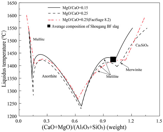 Pseudo-binary phase diagrams are often used by operators and researchers to discuss the effect of slag composition on liquidus temperatures. A typical composition of Shougang BF slag [27] is shown in Figure 5. It can be seen that the BF composition is in the melilite primary phase field with the liquidus temperature 1400–1450 °C. Shougang has a stable supply of raw materials for the BF, resulting a relative stable Al2O3/SiO2 weight ratio of 0.4 in the slag. The additions of MgO and CaO can be adjusted according to the requirements. It is more convenient to use a pseudo-binary phase diagram to discuss the effect of a single parameter on liquidus temperature. The red line, as shown in Figure 5, indicates how the pseudo-binary phase diagrams are interpolated from the pseudo-ternary phase diagram. Based on the pseudo-ternary phase diagram determined, the effects of MgO/CaO, and quaternary basicity (CaO+MgO)/(Al2O3+SiO2) on the liquidus temperature can be considered from different directions, as shown in Figure 5.