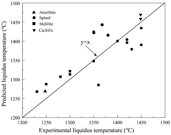 As discussed above, the current composition of the Shougang blast furnace slag is usually in the melilite primary phase field as shown in Figure 6 and Figure 7. Melilite is the solid solution between akermanite (2CaO·MgO·2SiO2) and gehlenite (2CaO·Al2O3·SiO2). Figure 8 presents the comparison of the experimental data and FactSage predictions. The experiments No. 44–63 listed in Table A1 were used to calculate the primary phases and their liquidus temperatures by FactSage 8.2. Melilite is the primary phase in experiments No. 44–63. However, it can be seen from Figure 8 that anorthite, spinel and Ca2SiO4 are also predicted by the FactSage in addition to melilite. Up to 75 °C difference of the liquidus temperature is observed between the predictions and experimental results.