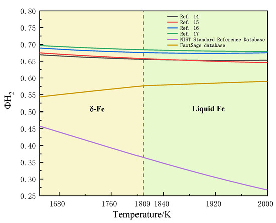 In addition, characterises the partial pressure of hydrogen required for the reaction to occur, and the data given in References 14–17 all show a decreasing trend when fitted to data from the NIST database. Although the FactSage database gives the opposite result in this dimension, it does not show a significant upward trend until 1809 K and a much slower upward trend after 1809 K. It is considered that this fit does not affect subsequent conclusions. This suggests that the amount of hydrogen required for the reaction to occur is essentially constant or even less as the temperature increases.