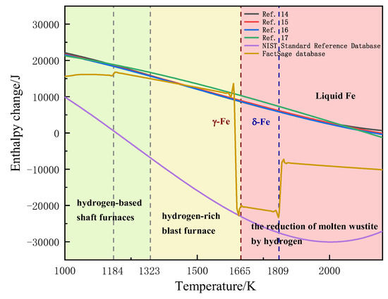 At low temperatures (1123–1323 K), i.e., the temperature range applicable to hydrogen-based shaft furnaces, the fits given by the four thermodynamic handbooks and the FactSage database all showed a strong absorption of energy. At 1320 K, the enthalpy changes for Reaction (5) were 15,918.1411 J/mol (Reference 14), 15,854.2651 J/mol (Reference 15), 15,733.8543 J/mol (Reference 16), 16,730.8318 J/mol (Reference 17) and 15,011 J/mol (FactSage database), which is thought to absorb more energy. The NIST database differs significantly from the above five data sets in this range and the regularity is questionable.