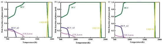 CALPHAD calculations of the three HEAs: (a) Ti25 alloy, (b) Ti30 alloy, (c) Ti35 alloy.
