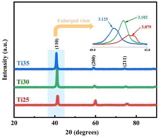 XRD of the Ti25 alloy, Ti30 alloy and Ti35 alloy.
