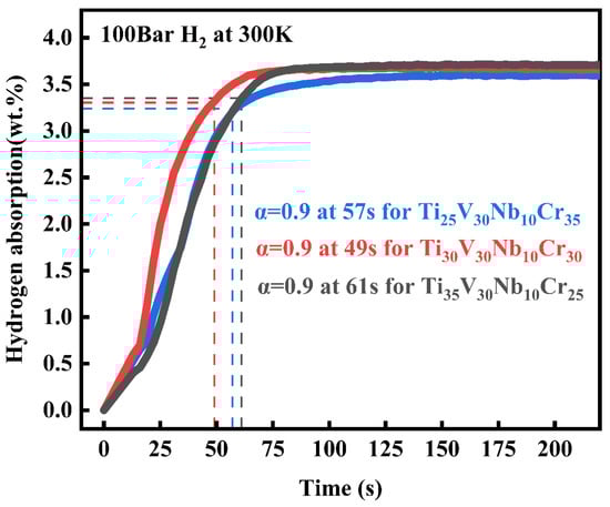 The construction of numerical models for hydrogen–metal reactions, especially the rate of hydrogen release reaction, is essential for the application of hydride-based hydrogen storage devices [28]. Herein, all three TiVNbCr alloys with different Cr contents underwent an activation process by high temperature evacuation, and were then completely hydrogenated at 300 K under a H2 atmosphere at 100 bar. The kinetics of hydrogen absorption after activation is shown in Figure 4. After less than 180 s of the hydrogen absorption process, the Ti25, Ti30, and Ti35 alloys reached the maximum hydrogen absorption equilibria of 3.60 wt.%, 3.67 wt.%, and 3.72 wt.%, respectively. It took nearly 60 s to reach 90% hydrogen reaction fraction (ξ = 0.9) for the three alloys, and the fast kinetics may be attributed to the severe lattice distortion in the HEA [29]. Moreover, the hydrogen-to-metal ratio can easily reach 2, as with our previously reported TiVNbCr alloy [23], which, again, demonstrates the wide range of compositional options for HEAs as hydrogen storage materials.