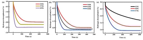 After the completion of hydrogenation, the kinetics of hydrogen desorption from the alloy was investigated at different temperatures. All the hydrogen desorption tests were started with the fully hydrogen-absorbing samples at 300 K temperature and 100 bar H2. Considering the structural design of the Sieverts PCT device, the sample was dehydrogenated into a large enough cavity that the final stable hydrogen pressure was close to 0.06 MPa. As shown in Figure 5a, the Ti25 alloy was subjected to hydrogen release at temperatures of 353 K, 373 K, and 423 K, respectively. The kinetics of hydrogen release from the Ti25 alloy is not as fast as that of hydrogen absorption. It takes ~600 s for the alloy to reach hydrogen release equilibrium, whereas 1.96 wt.%, 2.21 wt.%, and 2.48 wt.% capacity of hydrogen can be desorbed at 353 K, 373 K, and 423 K, respectively. The temperature increase speeds up the desorption process, and dehydrogenation at 423 K even takes no more than 200 s to complete. Similar operations were carried out for Ti30 and Ti35 alloys. It should be noted that different alloys were tested at different temperatures to ensure better hydrogen release. We also conducted hydrogen release tests on Ti30 and Ti35 alloys at the temperature of 353 K, yet the amount of hydrogen release was essentially negligible. This is understandable because the lower valence electron concentration (VEC) of the alloy makes it difficult to release hydrogen [30]. For the sake of comparability of data and subsequent fitting of kinetic equations, we conducted hydrogen release tests at higher temperatures for Ti30 and Ti35 alloys. The hydrogen release properties of the Ti30 alloy were investigated at 393 K, 423 K, and 443 K, while the same tests were performed at 423 K, 443 K, and 473 K for the Ti35 alloy, as is shown in Figure 5b,c. As in the case of the Ti25 alloy, the increase in temperature favors the improvement of the hydrogen release kinetics of Ti30 and Ti35 alloys. Due to the stronger hydrogen–metal interaction, the Ti30 and Ti35 alloys desorb less hydrogen, and they typically only release up to 2 wt.% of hydrogen capacity, as is listed in Table 2.