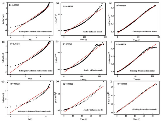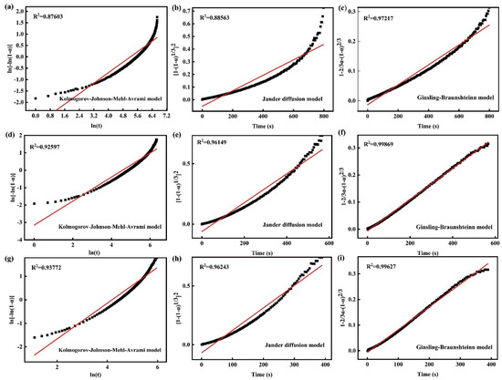 The Ginstling–Brounshtein equation [36] is also a kinetic model to describe three-dimensional diffusion. On the basis of the Jander model, the Ginstling–Brounshtein model modifies the assumption of constant diffusion cross-sectional area, which means that diffusion is considered as a non-stationary system, as follows: