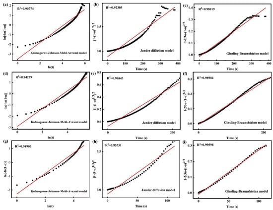 The hydrogen desorption kinetics fitting of Ti30 alloy at different temperatures. (a–c) at 353 K, (d–f) at 373 K, and (g–i) at 423 K.