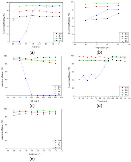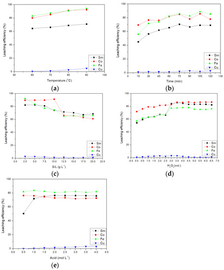 Finally, when the temperature was 80 °C, the time was 75 min, the S/L ratio was 7.5 g L−1, the addition of hydrogen peroxide was 3.5 vol.%, and the acid concentration was 1.5 mol L−1, the leaching efficiencies of Sm, Co, Fe, and Cu were 75.18, 74.58, 82.42, and 1.35%, respectively.