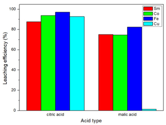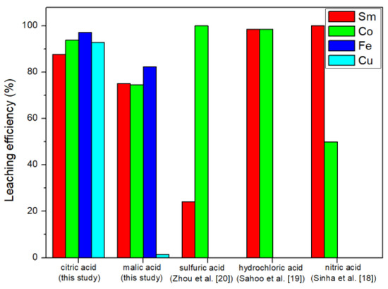 In the study of Cu leaching with malic acid, the Cu leaching rate was zero when the redox potential (Eh) of copper was low [26]. Therefore, we needed to add more oxidizers for effective leaching. If we added more oxidizers, it would definitely increase the cost. We do not recommend malic acid for leaching. Ultimately, we found that citric acid was able to leach SmCo magnets.