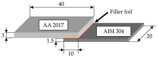 Aluminum alloy AA 2017 sheets (Alumeco Service GmbH, Coswig, Germany) with dimensions of 40 × 20 × 3 mm3 and austenitic stainless steel AISI 304 sheets (HSM Stahl- und Metallhandel GmbH, Georgensgmünd, Germany) with dimensions of 40 × 20 × 1.5 mm3 were used as base materials. The chemical compositions of the used materials are presented in Table 1. The Al-Ag-Cu-Si filler was applied as a melt spun foil. Brazing tests have shown that two foils with a thickness of 70 µm have to be used. The strength value used to produce the brazed joint was about 100 µm due to the interaction of the braze metal with the aluminum base material.