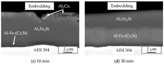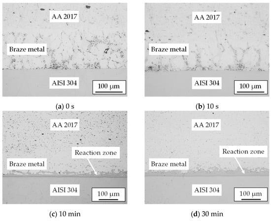 The microstructures of the brazed joints are presented in Figure 2. During the brazing process, the wetting between liquid filler metal and aluminum base material on the one hand and between liquid filler and stainless steel on the other hand was realized by a chemical reaction. On the aluminum base material side, a type of welded joint formed during the interaction of the aluminum-containing braze metal with the aluminum base material. The reaction zone between the braze metal and stainless steel was formed due the diffusion of Fe and Cr atoms from the stainless steel into the braze metal and their reaction with the atoms of chemical elements of the braze metal. In the case of the joints, produced via induction brazing, a very small thickness of the reaction zone between the braze metal and the stainless steel could be seen. Compared to these joints, the reaction zone of the vacuum-brazed joints grew more clearly with an increase in the holding time. Moreover, the vacuum-brazed joints showed good quality with a minimum number of pores, too.