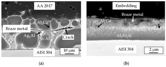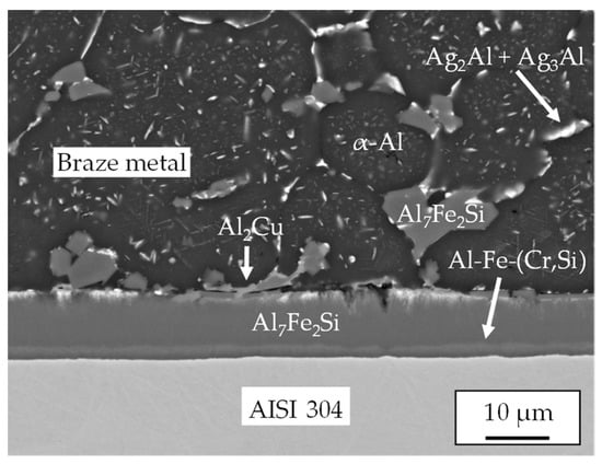 To determine the chemical composition of the intermetallic layer at the interface to the stainless steel quantitatively via EDS analysis, high layer thickness was required. This could be achieved by increasing the holding time of the brazing process. Therefore, it was necessary to perform the EDS analysis on vacuum-brazed samples. For the joints brazed at 540 °C for 10 min, the thickness of the reaction zone was about 10 μm. These samples were used to measure the chemical composition of the microstructural constituents of the brazed joints via EDS. The analyses indicate that an α-Al solid solution with a low content of Ag (4 at.%) as well as Al2Cu, Ag2Al + Ag3Al, and Al7Fe2Si precipitates formed in the braze metal; Figure 3. Furthermore, it can be seen that the reaction zone consisted of two intermetallic layers: an Al7Fe2Si layer and an Al-Fe-(Cr,Si) layer with 4 at.% of Cr and 2 at.% of Si.
