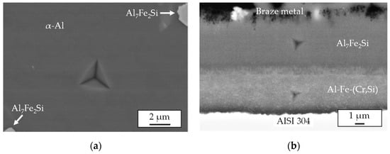 For the comparison of the indents’ size in various of microstructural constituents in the brazed joint, the indents in the Al solid solution in the braze metal and in Al7Fe2Si and Al-Fe-(Cr,Si) intermetallic layers at the interface to the stainless steel are presented in Figure 4. It can be seen that the indent produced in the Al solid solution (Figure 4a) showed a higher penetration depth and a bigger contact area in comparison to the indents set in the intermetallic layers (Figure 4b). This already shows that the intermetallic layers had a higher indentation hardness than the Al solid solution. In addition, the indents produced in the intermetallic layers showed a good position inside the intermetallic layers and an acceptable distance to the adjacent stainless steel and other microstructural constituents in the braze metal. The indentation hardness and the elastic indentation modulus of the Ag2Al and Ag3Al precipitates could not be measured due to their small size.