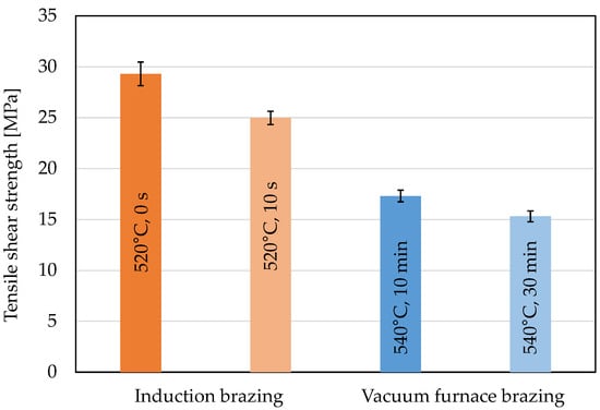 The results of the tensile shear tests of the investigated joints are presented in Figure 6. It can be clearly seen that the joints produced via induction brazing had higher strengths compared to the vacuum-brazed samples. Compared to all the tested joints, the samples brazed at 520 °C without holding time achieved the highest tensile shear strength of about 32 MPa. The strength values were significantly higher than the results of Grund et al. (20 MPa). Grund et al. reported stress-induced cracks at the interface to stainless steel, which occurred due to the local overheating of the liquid brazing filler and resulted in the formation of thick brittle Fe-Al intermetallic layers at the interface to the stainless steel [9]. A holding time of 10 s led to a maximum tensile shear strength of 26 MPa. The decrease in the strength values can also be explained by the increase in holding time or the growth of the Al7Fe2Si and Al-Fe-(Cr,Si) intermetallic layers in the reaction zone [17]. For the vacuum-brazed joints, a maximum tensile shear strength of 18 MPa was reached in samples brazed at 540 °C for 10 min. The decrease in tensile shear strength with prolonged holding time can be explained by the growth of the reaction zone. Moreover, the long holding time led to the strong diffusion of the elements of the braze metal into the aluminum base material. This resulted in the thickness reduction in the brazing gap, which could have led to a decrease in the tensile shear strength.