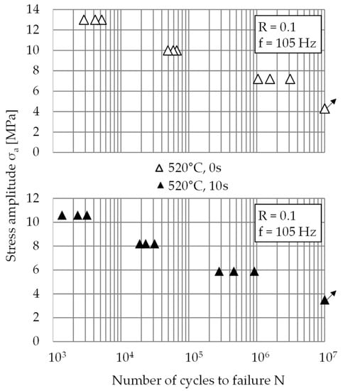 Fatigue behavior of the joints produced via induction brazing at 520 °C and holding times of 0 s and 10 s.