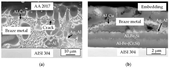 Analogously to the joints brazed at 520 °C without holding time, SEM investigations were carried out on the joints brazed at 520 °C for 10 s. The cross section of the “run out” fatigue-tested samples, which reached the defined limited number of cycles, and the cross section of the fatigue-tested samples, which failed at a number of cycles of 3 × 103 at a stress amplitude of 10.6 MPa, are presented in Figure 10. The cross section of the “run out” sample also shows that the crack occurred in the braze metal, especially in the eutectic constituents; Figure 10a. For the sample which failed at a number of cycles of 3 × 103 at a stress amplitude of 10.6 MPa, it was found that the fracture also occurred in the braze metal; Figure 10b. It can be summarized that the reaction zone did not significantly influence the fracture mechanism of the brazed joints.