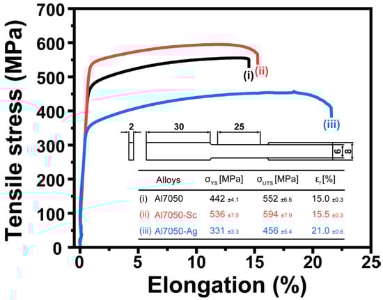 Tensile stress–strain curves obtained from T6-tempered (120 °C, 24 h) Al7050, Al7050-Sc, and Al7050-Ag alloys.