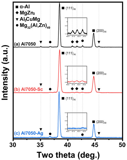 Figure 2 shows the XRD profiles of 2θ scans recorded from the Al7050, Al7050-Sc, and Al7050-Ag alloys. The recorded XRD profiles consist of strong major peaks of α-Al (FCC, ), with several minor peaks. For the Al7050 alloy, the minor peaks are identified as MgZn2 (η or η’ phase, HCP, P63/mmc), Al2CuMg (S phase, Cmcm), and Mg32(Al, Zn)49 (T phase, Im) [15,26,27]. Based on earlier reports, the S and T phases preferentially precipitated at grain boundaries of the Al7xxx alloy system [28,29]. For the Al7050-Sc alloy, the peaks observed in the XRD profiles are almost identical to that of the Al7050 alloy. The peaks of η (or η’), S, and T phases are well defined for the Al7050-Sc alloy, as shown in Figure 2b. The peak intensities of η (or η’), S, and T phases, however, significantly decrease in the XRD profile of the Al7050-Sc alloy. For the Ag microalloying element, the peak intensities of S, T, and η (or η’) phases further decrease in the Al7050-Ag alloy compared with those of Al7050 and Al7050-Sc alloys, as shown in Figure 2c.