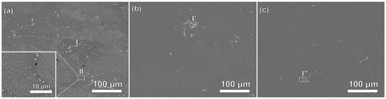 Figure 3 shows typical back-scattered electron (BSE) images of the investigated alloys. We confirmed that the microstructure of the investigated specimens is very homogeneous regardless of sample positions. The EDS analysis was carried out in at least five different areas to obtain the averaged elemental ratios. As shown in Figure 3a, the Al7050 alloy mainly consists of Al grains with intermetallic particles inside the Al grain (inset of Figure 3a) and at the grain boundaries (dotted-box). The observed intermetallic compounds can be then divided into two groups with respect to their size. The large intermetallic particles are 10~20 μm, while the fine intermetallic particles are less than a few μm (inset of Figure 3a). According to the chemical analysis (Table 2), the observed large intermetallic particles (I) are mainly composed of Zn/Mg/Cu, while the fine intermetallic particles (II) consist of Zn/Mg. Compared with the XRD indexing results, therefore, the large intermetallic particles are considered to be S (Al2CuMg) and T (Mg32(Al, Zn)49) phases [28,29], while the small intermetallic particle is revealed to be stable η (MgZn2) phase [30,31]. These intermetallic phases, however, are greatly affected by trace additions of Sc and Ag. As shown in Figure 3b,c, the fractions of intermetallic particles obviously decrease in both Al7050-Sc and Al7050-Ag alloys, which agree well with the XRD results. Especially, the small intermetallic compounds of stable η (MgZn2) phase almost disappear in both Al7050-Sc and Al7050-Ag alloys. For the large particles observed in the Al7050-Sc alloy, the chemical analysis (I’) reveals that the main elements are Zn/Mg/Cu, the same large particles found in the Al7050 alloy. Considering XRD identification, therefore, the large intermetallic compounds observed in the Al7050-Sc alloy can also be defined as S (Al2CuMg) and T (Mg32(Al, Zn)49) phases. Similarly, the large particles (I’’) observed in the Al7050-Ag alloy are identified as T phase with a small amount of S phase. Based on the recorded BSE images, therefore, trace addition of Ag further restricts the formation of T (Mg32(Al, Zn)49) and S (Al2CuMg) phase compared with the Sc microalloying element, resulting in a significant decrease in the fraction of large particles in the Al7050-Ag alloy, as shown in Figure 3c.