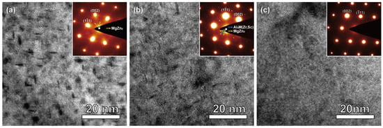 Figure 4 shows phase contrast images of Al grains recorded from synthesized Al alloys. First, as shown in Figure 4a, uniformly distributed dark contrasts are observed in the Al grain of Al7050, as indicated by an arrow. These nanosized uniform contrasts resulted from coherent pre-precipitates (GP-zone) generated by the coherent misfit strain perpendicular to the observation axis of [110]Al. As shown in the inset of Figure 4a, the diffuse streaks along the g{111} of Al also indicate that the Al matrix has planar faults in the GP-zone. In the Al7050 alloy, the number density of precipitates (GP-zone) is calculated at 3.8 × 104 counts/μm2. For the Al7050-Sc alloy, the representative phase contrast image shows that the pre-precipitates found in Al7050 grew to ~1 nm thick and ~6.4 nm in diameter with trace addition of Sc. On the other hand, the number density of precipitates decreased to 2.1 × 104 counts/μm2 in the Al7050-Sc alloy. Similar to the Al7050 alloy, the existence of fine precipitates formed streaks in the electron diffraction pattern. As shown in the inset of Figure 4b, the electron spot of provides direct evidence for the formation of metastable η’ (MgZn2) phase [30]. Furthermore, extra precipitates spots are found at of Al, which indicates the formation of Al3M (M: Sc, Zr) phase. The Al3M phase typically forms in spherical shape [32], as indicated in Figure 4b. In contrast, the trace addition of Ag hinders the formation of hardening precipitates in the Al matrix, as expected from the XRD results (Figure 2). As shown in Figure 4c, the major hardening precipitates of η or η’ phase are not observed in the Ag-microalloyed Al7050 alloy.