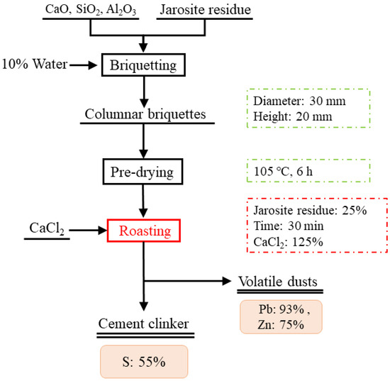 A schematic flowchart of the jarosite residue treatment process is shown in Figure 1. The dried jarosite residue was mixed well with CaO, SiO2, and Al2O3 and pressed at 5 MPa to form a columnar briquette with a diameter of 30 mm and a height of 20 mm. The columnar briquette was roasted at 1400 °C in a muffle furnace to prepare cement clinker [20,21,22]. The effects of jarosite residue addition, roasting time, and mineralizer CaCl2 on the phase of cement clinker and volatilization behavior of important elements during roasting was studied. After roasting, the roasted sample was rapidly cooled to room temperature and crushed in a ball mill for further analysis.