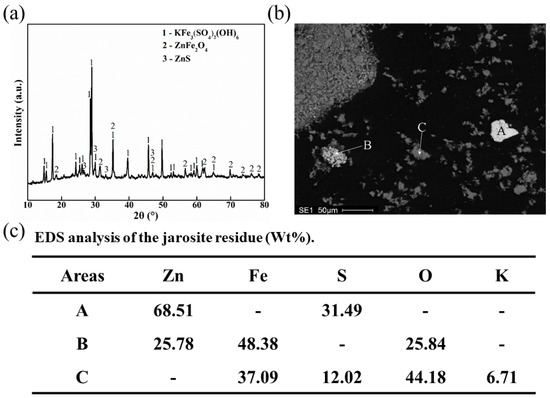 XRD pattern, SEM image, and EDS analysis of the jarosite residue: (a) XRD pattern of the jarosite residue; (b) SEM image of the jarosite residue; (c) EDS analysis of areas A, B, and C.