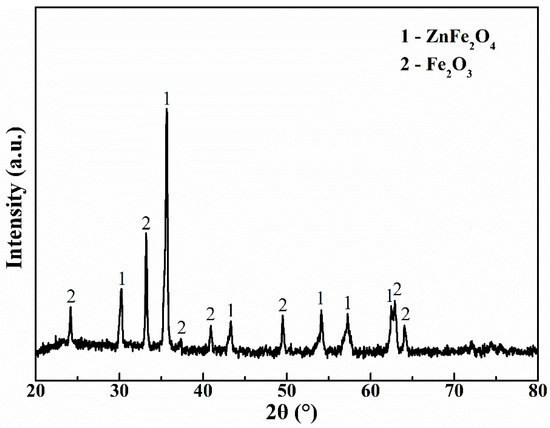 The third stage begins at 450 °C and ends at 1100 °C, with a weight loss of 30%. As shown in Figure 3, there is a strong endothermic peak at approximately 725 °C, and no significant heat absorption peak is observed when the temperature is higher than 725 °C, but the mass loss continues until the temperature rises to 1100 °C. XRD quantitative analysis was carried out using the XRD result in Figure 4. The results show that the roasted jarosite is composed by ZnFe2O4 and Fe2O3 with a weight percentage of 56.3% and 43.7%, respectively. As a result, the Zn to Fe ratio in the roasted jarosite is close to that of the jarosite residue, which means that there is almost no Fe and Zn loss during the roasting process. This also indicates that the mass loss at this stage is caused by desulfurization [15]. At this stage, part of the mass loss is assigned to the decomposition of ZnSO4 and PbSO4 [23]. The reaction may take place according to Equations (8)–(10).