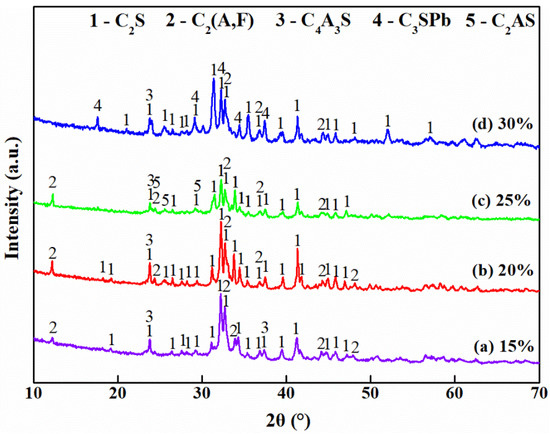 XRD patterns of roasting lime clinker with different additions of jarosite residue. (Conditions: Roasted temperature at 1400 °C for 30 min; C2S: 2CaO·SiO2; C3SPb: 3CaO·SiO2·PbO; C2(A,F): 2CaO·AlFeO3; C2AS: 2CaO·Al2O3·SiO2; C4A3S: 3CaO·3Al2O3·CaSO4.).