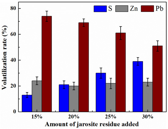 Volatilization rates of S, Zn, and Pb during cement roasting under different jarosite residue additions. (Conditions: roasted temperature at 1400 °C for 30 min.).