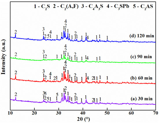 The effect of roasting time on mineral formation and the behavior of important elements in cement clinker was studied. The XRD patterns of the cement clinker roasted for 30, 60, 90, and 120 min at 1400 °C are shown in Figure 8. Under the different roasting times, the roasting cement clinker obtained contains C2S, C4A3S and ferroaluminate. In addition, the formation of C3SPb was observed in the XRD patterns of the cement clinker obtained for 60 min and 90 min. This indicates that the increase in roasting time favors the reaction between lead oxide and C3S, which is not conducive to the volatilization of lead. Table 4 shows that roasting time has almost no effect on the content of various components in the cement clinker and that the active ingredients in the cement clinker can be formed in only 30 min.