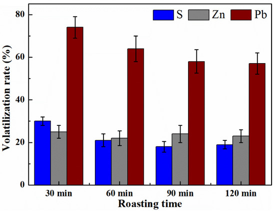 Volatilization rates of S, Zn, and Pb during cement roasting at different roasting times. (Conditions: 25% jarosite residue roasted at 1400 °C.).