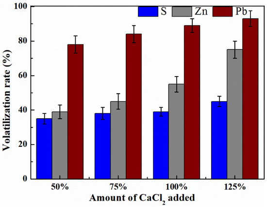 The volatilization rates of S, Pb and Zn in the presence of different amounts of the mineralizer CaCl2 are shown in Figure 11. As the addition of the mineralizer CaCl2 increased from 50% to 125%, the volatilization rate of Pb increased from 78% to 93%, while that of Zn increased from 39% to 75%. The addition of the mineralizer CaCl2 can react with Pb and Zn in the jarosite residue to form volatile chlorides, thus favoring the recovery of Pb and Zn. At the same time, the volatilization rate of S slightly increased.