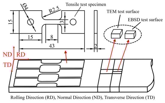 The microstructures of the specimens were characterized using an optical microscope (OM, Zeiss, Primotech, Berlin, Germany), the X-ray diffraction (XRD, Bruker, Karlsruhe, Germany), the electron back-scatter diffraction (EBSD, Carl Zeiss, Oberkoichen, Germany), and a JEOL-2100F transmission electron microscope (TEM, FEI Company, Hillsboro, OR, USA). The samples for OM observation were mechanically ground, then etched in standard Keller’s reagent (1 mL HF + 1.5 mL HCl + 2.5 mL HNO3 + 95 mL H2O). The samples for EBSD observation were firstly mechanically ground and then electrochemically polished in the mixed 10% HClO4 and 90% C2H5OH solution at a temperature of −20 °C. In order to perform the TEM analysis, the specimens were mechanically thinned to thicknesses of about 60 μm, punched into foils of 3 mm in diameter, and electro-polished in 30% HNO3 and 70% CH3OH solution below −30 °C. The analysis was performed at an acceleration voltage of 200 kV. Positions and dimensions of the specimen for microstructure observation and tensile test are shown in Figure 1.