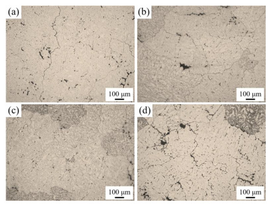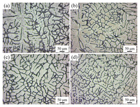 Optical micrographs of homogenized alloys with different Ce contents (a) AL1; (b) AL2; (c) AL3; and (d) AL4.