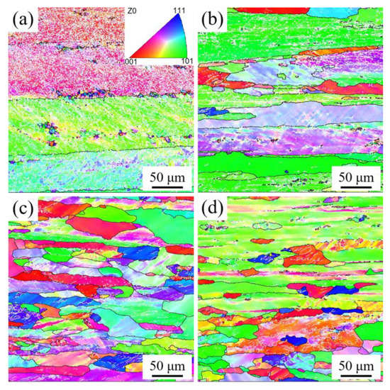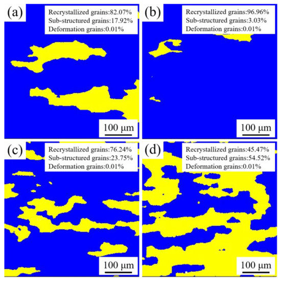 Figure 5 illustrates the microstructures of AL1-AL4 alloys after hot rolling. The deformation grains, sub-structured grains (recovered with sub-grains), and recrystallized grains of four alloys are shown in Figure 5 in three colors (red, yellow, and blue, respectively). According to average misorientation angles, these grains are classified as recrystallized grains when their average misorientation angle is above 15°, and as sub-structured grains if their average misorientation angle is between 3° and 15°. The grains are defined as deformation grains when their average misorientation angle is below 3°.