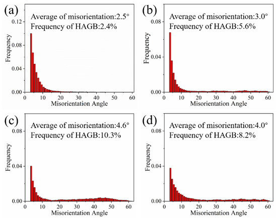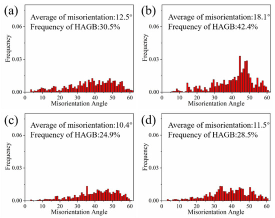 Figure 10 shows the misorientation distributions and the fraction of HAGBs of AL1-AL4 alloys after T6 treatment. The misorientation below 3° has been removed from Figure 10. Compared with Figure 6, it is clear that the LAGBs have transformed into HAGBs. The fraction of HAGBs for AL1 alloy is 30.5%, and the average misorientation angle is 12.5°, as shown in Figure 10a. When the Ce content of the alloy changes from 0.1%, 0.2%, to 0.3%, the fractions of HAGBs are 42.4%, 24.9%, and 28.5%, respectively. Meanwhile, the average misorientation angles are 18.1°, 10.4°, and 11.5°, respectively, as shown in Figure 10b–d.