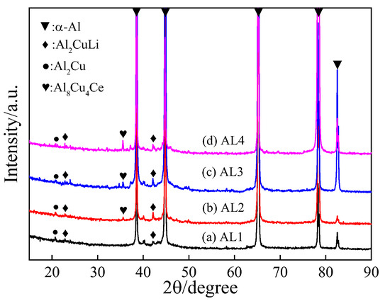 To clarify the effects of Ce enrichment particles in Al-Cu-Li alloys on inhibition of recrystallization. The Ce enrichment phases were investigated by XRD, and the results are shown in Figure 11. The XRD patterns clearly show the presence of Al8Cu4Ce phases in AL2-AL4 alloys after T6 treatment. The improved recrystallization resistance achieved by Ce addition can be attributed to the formation of these Al8Cu4Ce phases in Al-Cu-Li alloy [26]. These Al8Cu4Ce particles might exert a Zener pressure on the grain boundary, which would retard their migration and inhibit recrystallization [27].