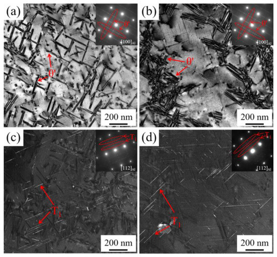 SAED patterns and dark field (DF) and bright field (BF) TEM images of AL2 (a), (c), and AL1 (b), (d) alloys (a), (b) θ′ precipitates (direction parallels to <100>Al); (c), (d) T1 precipitates (direction parallels to <112>Al).