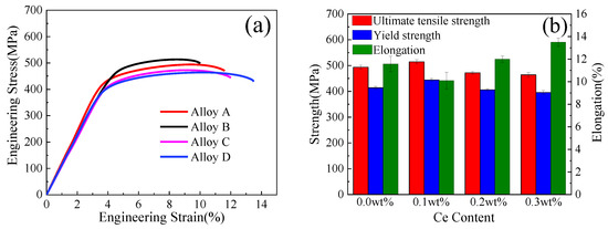 Tensile test of the alloys after T6 treatments. (a) Engineering stress–strain curves; (b) Tensile properties curves.