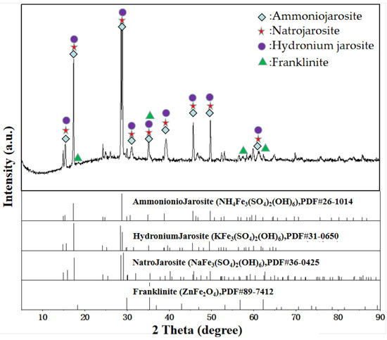 Jarosite precipitation presents as solid residues, which have been classified as prevailing hazardous waste in the hydrometallurgy industry [1]. Jarosite precipitation is acidic in nature and contains gangue as well as high concentrations of heavy or toxic elements (lead, zinc, sulfur, cadmium, chromium and copper) which are susceptible to leaching. Thus, its disposal has become a major environmental issue worldwide [2]. The most common process to remove iron from lixivium in the zinc hydrometallurgy industry is through the jarosite precipitation process using alkali, such as ammonia, sodium or potassium as MeFe3(SO4)2(OH)6 (Me = K+, Na, NH4+, H3O+, etc.) [1,3]. The jarosite precipitate often contains small amounts of lead, arsenic, cadmium and mercury [3,4,5], as well as some co-precipitation of divalent base metals ions, such as Cu2+, Zn2+ and Co2+ [6]. Zinc industries produced huge quantity of jarosite during the zinc extraction process as solid residues. Over 1 million tons of jarosite is released annually in China [7]. This makes the jarosite precipitate waste one of the biggest environmental problems in the zinc production industry, resulting in the recycling and reuse of jarosite precipitate being of great importance. Several methods (e.g., baked, acid-soluble, alkali-soluble and thermal decomposition) have been developed and used in recycling metals from jarosite residues.