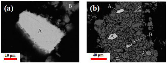 SEM of polished piece of aggregated jarosite residue (a) and enlarged area (b) (A: Spectrum 1, B: Spectrum 2).