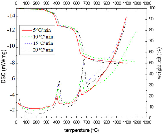 TG-DSC was performed on an apparatus (SDT Q600, TA USA, Inc.). The carrier gas was nitrogen flowing at 100 mL·min−1. The heating rates were set at 5, 10, 15 and 20 °C·min−1, respectively. TG was used to recorded weight loss and DSC was used to determine endothermic and exothermic heat effects accompanying physical or chemical changes in the sample.