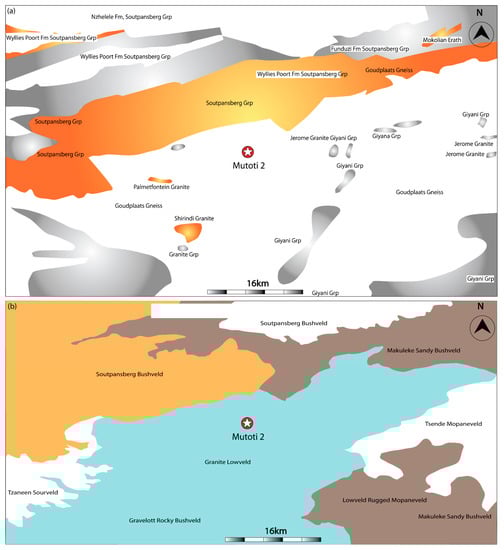 - Brandl, G. The Geology of the Pietersburg Area: Explanation of Sheet 2328, Scale 1: 250 000; Department of Mineral and Energy Affairs, Geological Survey: Pietersburg, South Africa, 1986. [Google Scholar]