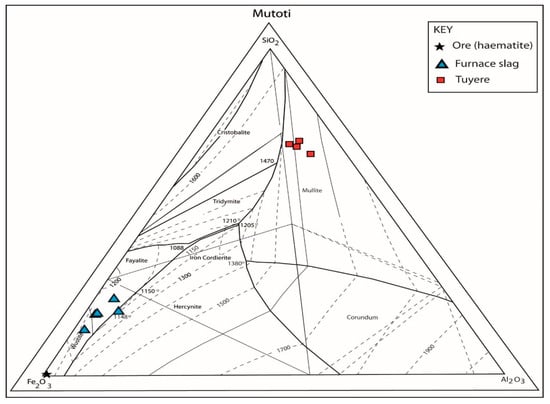 Bringing together, the microscopic and compositional analyses of the Mutoti 2 iron production remains, it becomes clear that iron was smelted in areas contiguous with settlement in this very large first-millennium CE site. The remnants of furnace walls and tuyeres with slagged ends when combined with finds of iron-rich ores point to smelting processes. However, the bloom fragments also suggest that reduced iron was consolidated into usable billets on site, completing the sequence of production operations. Mineralogically and chemically, the tuyeres were dominated by silica interspersed with clay minerals. WD-XRF results showed that the levels of alumina were consistent across the samples. The tuyeres and furnace walls were sufficiently refractory to withstand the temperatures reached in the furnaces. The high amounts of iron oxide however showed that perhaps the technology relied on the melting ceramics to provide part of the fluxing materials during the reduction of very pure ores with nearly 100 wt% iron oxide. The slags are all very rich in iron oxides with minimal amounts of fluxing alkali and earth alkali oxides. It appears that some of the titania in the ore and ceramics were inherited by the slag, establishing a genetic relationship between these different inputs into the system. Given the possibility that high-grade magnetite with few accessory minerals was smelted, it is possible that the smelters may have added sand (as a flux) to facilitate slag formation during the smelting process [49]. However, the very high amounts of iron oxide in the slags suggest that most of the iron oxide was retained in the slag. This may suggest that actually, the technology was self-fluxing with the fuel ash and melting technical ceramics providing the flux. If sand was added, then the benefits in terms of converting more iron oxide to metal were either not fully realised (70–80 wt% iron oxide is a lot) or were not much. When plotted on a three-component ternary diagram, the ore, slags, and ceramics all fall on a line, showing a hereditary relationship between them (Figure 4). Although the phase diagrams make assumptions about equilibrium conditions to describe processes in non-equilibrium, they are useful for estimating phases and temperatures achieved in bloomery furnaces [49]. Most of the slags plot in the left-hand corner, near the wüstite phase, reaching convergence with microscopic observations.