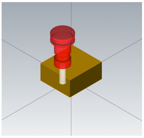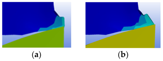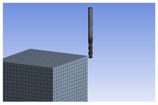 The simulation’s end time is set to 4.1 × 10−4 s, which gives enough time for the cutting edge on the tool to engage and remove material associated with the one cut fully. For this experiment, the first tool engagement average temperature is correlated directly to the temperature taken at the cutting interaction with the IR temperature gun on the “real” workpiece. The minimum step time is set to 5 × 10−9 s. There is fixed support set up on the bottom face of the workpiece representing the clamping force of the “real” material being held on the machine. The set-up of the tool to the workpiece is shown below in Figure 3, along with the Initial Cutting Engagement shown above in Figure 4. Table 1 shows the key parameters used in this study.