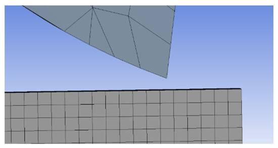 The next step of the process is to input these parameters (tool size and geometry, workpiece and tool material, cutting parameters) into the FEA software (Version: ANSYS 2020, Ansys, Inc., Canonsburg, PA, USA)and run a cutting simulation. This simulation can show the cutting interaction average temperature, which, as discussed above, is a leading indicator for the quality of the cut. The simulation can predict how the chip formation will occur, resulting in a real-life material removal rate (MRR). This information can help determine if the original cutting parameters used are optimal. For example, if the feed rate is too high or the d.o.c. is too large, the software will show extremely high temperatures, poor chip formation, and varying size measurements across the length of the cut. This high-temperature condition on the actual machine could result in the tool breaking, extreme “chatter” in the cut due to non-smooth cutting action, and even the workpiece moving on the machine. The explicit dynamics simulation representing a steel cutting tool engaging in an aluminum alloy workpiece (same interaction as above) is completed using ANSYS 2020. For the simulation, the material specifications are loaded for steel and AA6061-T6 aluminum alloy. The coefficient of static friction is set at 0.61, and the dynamic coefficient is set at 0.42, which represents the relationship between aluminum alloy and steel and is used as a body interaction in the simulation. For the boundary conditions of the model, the velocity (in positive X) is set to 5 ipm (or 127 mm per minute), and angular velocity (around Y) is set to 1200 rpm. A Hex Dominant Method Mesh pattern (mixed element type, predominantly hexahedral elements), as seen below in Figure 2, is used, setting the mesh of the tool body (rigid) at 0.025″ and the mesh of the workpiece (flexible) is set at 0.004″ (or 0.1016 mm). The mesh sizes are determined based on a mesh-sensitivity analysis. The workpiece mesh considered here consists of 15,625 nodes.