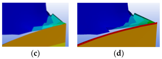Cutting Tool Engagement over 4 discrete time periods—(a) at 1.025 × 10−4, (b) 2.05 × 10−4, (c) 3.075 × 10−4, and (d) 4.1 × 10−4.
