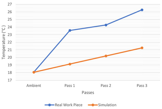Overall, there is a clear correlation between the temperature of the “real” part being machined and the temperature shown during the simulation with similar parameters shown below in Figure 6. Looking at the graphs in Figure 6, there is an initial offset of temperatures between the simulation and real-cut shown on the second temperature taken, which then follows a trend line correlating the data. This initial grid shift can be explained through a rise in temperature occurring when the first cutting edge engages the material, and this is challenging for the software to accurately determine this point of engagement. Although the trend lines of the data are offset, the similar temperature changes prove that the data from the simulation and the cut can be adjusted and used to accurately predict a real cutting situation. There is a correlation between the temperature-induced in the part and how accurate the cut is from determining the initial parameters. The technology is available today to accurately provide the FEA simulation and utilize it in a mixed reality environment. This combination of technologies has been seen in education, training, and force values for equipment usage, such as the force put into a ladder step—but has not specifically been combined in a CNC machining application. Additional simulation parameters can be easily added to this (measuring stress-induced in part by the cutting tool, the vibration of workpiece and tool in cut, sound measurements), all of which can reinforce the real-time mixed reality environment giving the machine operator even more information to help troubleshoot a poor cutting scenario.